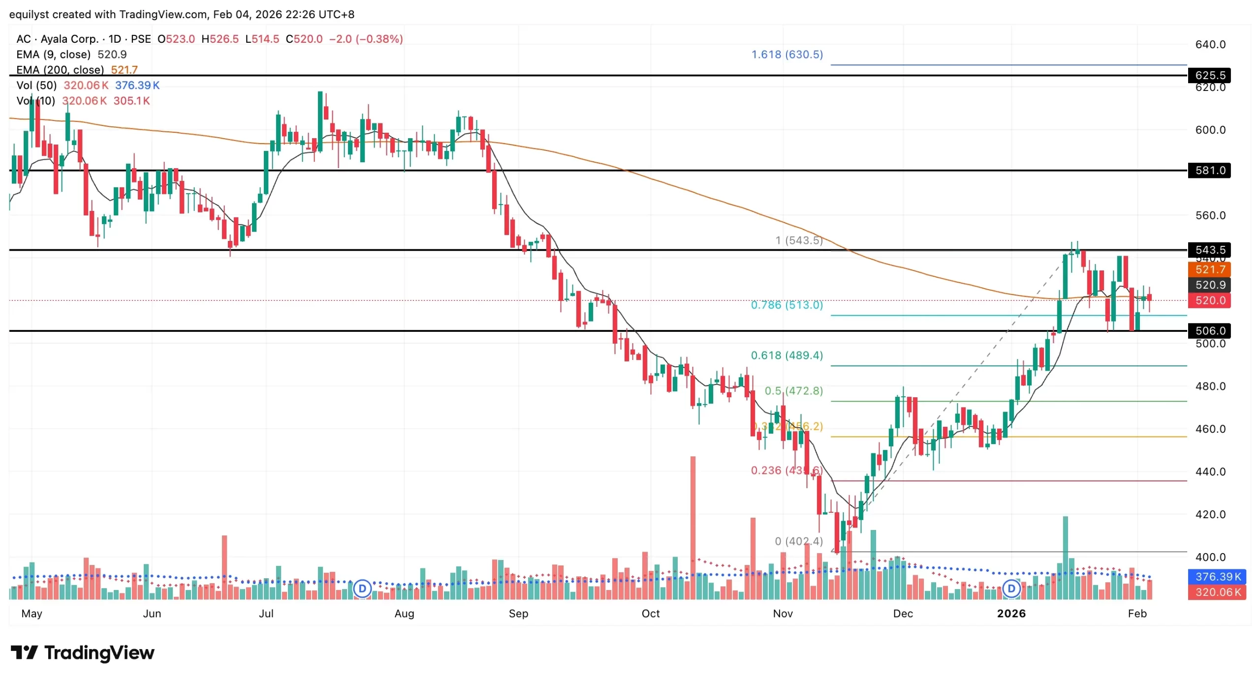 Ayala Corporation (AC) struggled to assert direction as price hovered near the convergence of its 9-day and 200-day exponential moving averages. The stock closed at ₱520.00, down 0.38%, on February 4, 2026, which underscores continued friction at a critical technical junction.