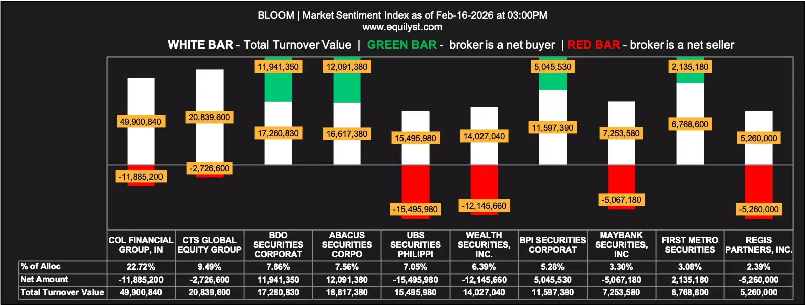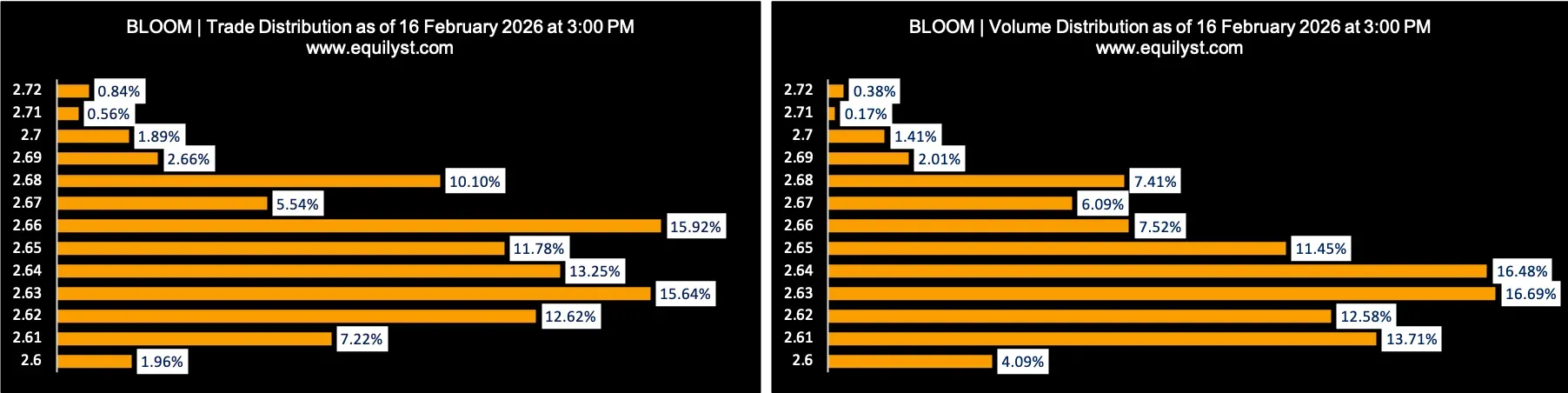 On February 16, 2026, BLOOM closed at ₱2.63 per share, down 2.95%, with a Net Foreign Selling of ₱21.10 million. The magnitude of foreign outflows reinforces the downside bias and suggests that institutional money continues to reduce exposure at current levels.