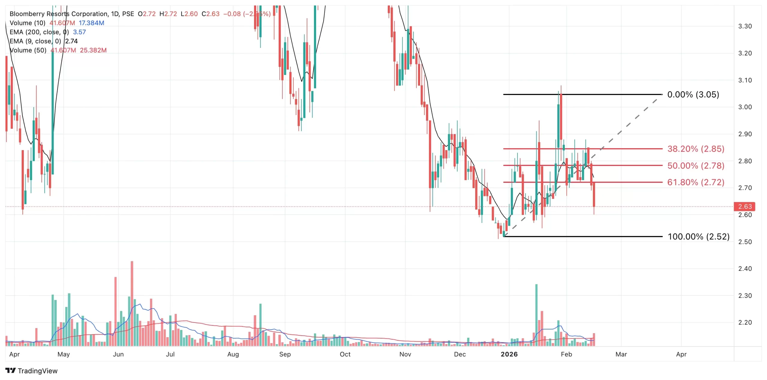 - Resistance aligns at ₱2.72 with the 61.80% Fibonacci retracement.