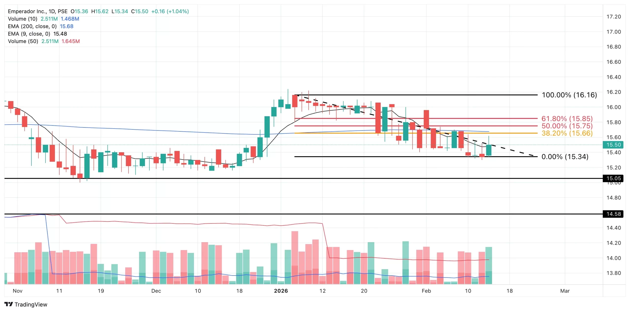 Immediate support rests at ₱15.34, while deeper structural support lies at ₱15.05. Overhead, resistance forms a defined band between ₱15.66 (38.2% Fibonacci) and ₱15.85 (61.8% Fibonacci). If EMI continues to consolidate, this band becomes the decisive battlefield between recovery attempts and renewed selling pressure.