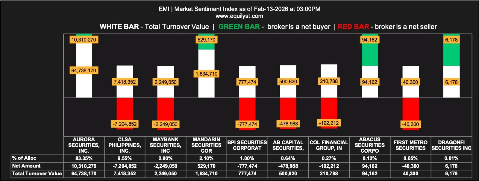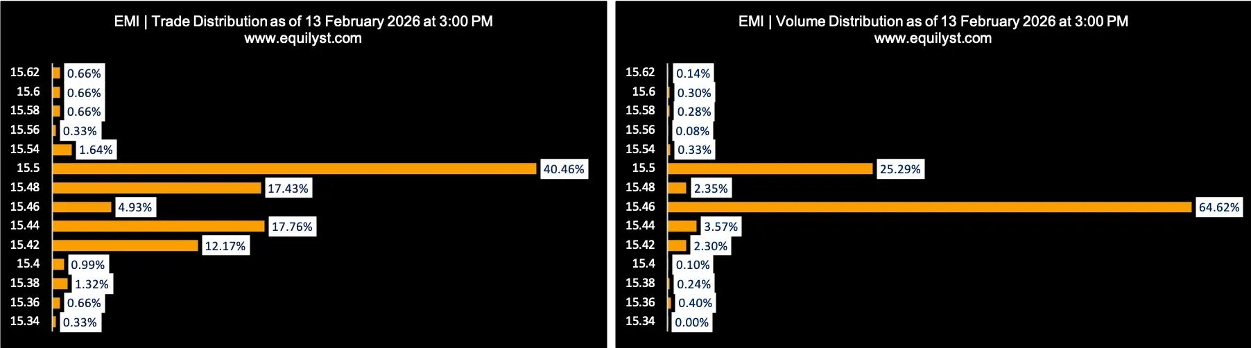 On February 13, 2026, EMI closed at ₱15.50, up 1.04%, despite recording a Net Foreign Selling of ₱9.3 million. The positive day change in the face of foreign selling suggests that domestic or selective institutional participation absorbed the supply intraday. However, this does not immediately reverse the broader downtrend bias.