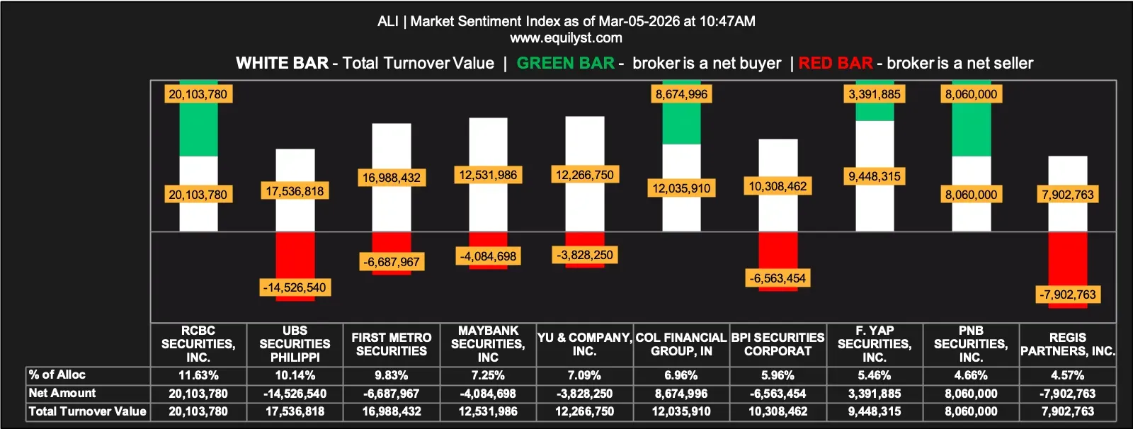 BDO and ALI demonstrate coordinated accumulation, strong Buying Average profiles, and concentrated broker conviction. Their structural sponsorship reflects demand dominance, suggesting a stable bullish undercurrent.