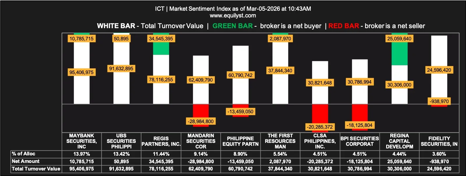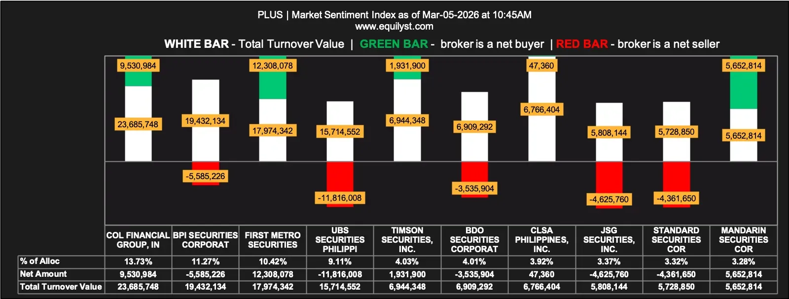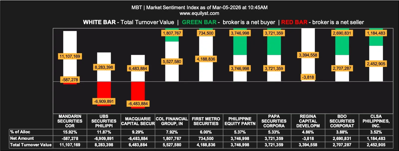As of March 5, 2026, on the time indicated on each chart, the five most actively traded stocks reveal a detailed picture of institutional positioning beneath headline price movements. The Market Sentiment Index highlights broker participation, execution efficiency, and conviction concentration rather than relying solely on closing prices to gauge market bias.