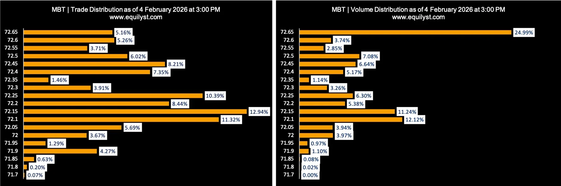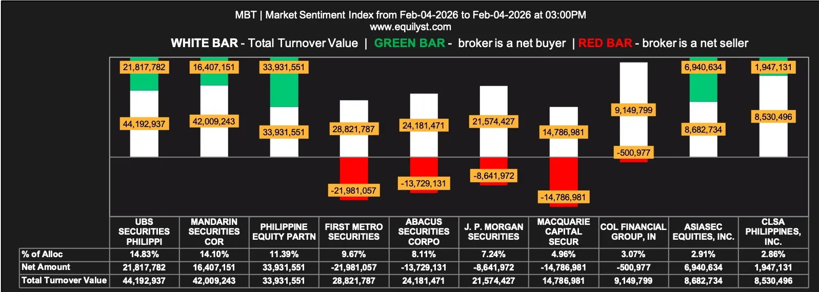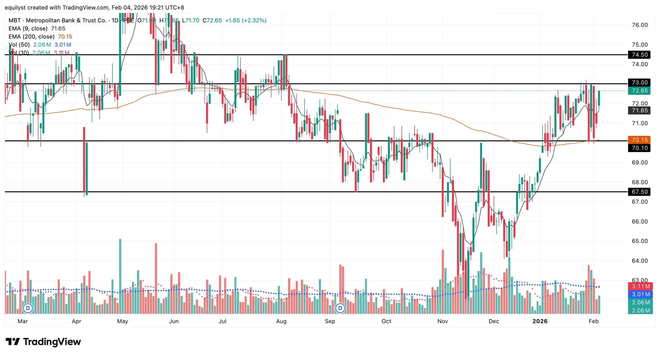 Metropolitan Bank and Trust Company (MBT) recorded a total turnover value of ₱149,014,384.00 and closed at ₱72.65, up 2.32%, as of February 4, 2026. The issue finished the session with a Net Foreign Buying position in excess of ₱72 million.