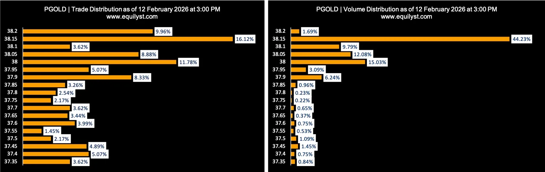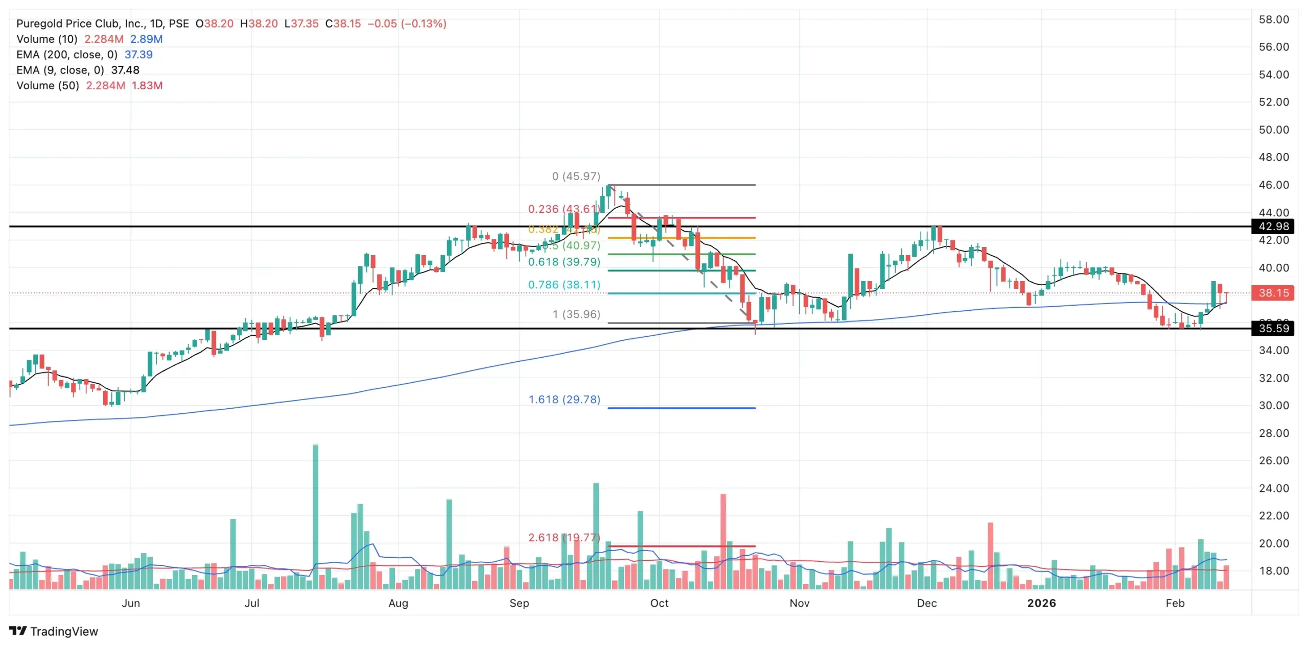 The year 2025 was a great year for Puregold Price Club (PGOLD) as it rose by 23.18%. PGOLD could have registered a higher year-to-date change for 2025 if the price direction didn’t reverse starting in the third trading week of September 2025. In 2026, PGOLD is still up by 0.39%, closing on February 12, 2026 at P38.15. On this day, a golden cross between the 9-day and 200-day EMAs was registered.