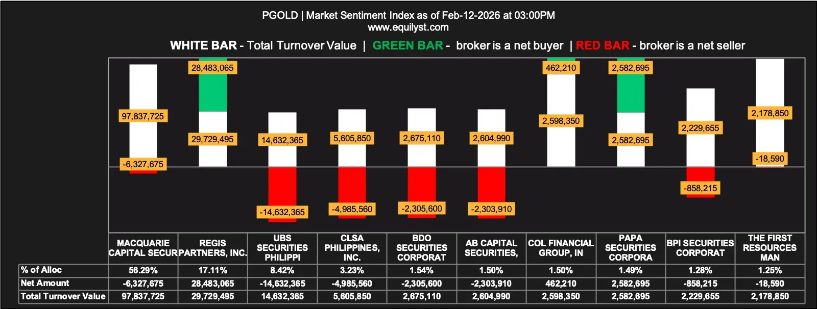 Conversely, the Market Sentiment Index remains bearish, signaling that a significant portion of brokers are either reducing positions or selling into strength. Only 45.16% of brokers posted a positive Aggregate Net Amount, and the same percentage had a higher Per-Broker Buying Average than Selling Average. The aggregate selling average exceeds the aggregate buying average, highlighting that the larger volume of trades is still dominated by sellers. While some participants engaged in 100% buying activity, the broader market leans cautious, suggesting that short-term bullish movements may be met with selling pressure. Investors should monitor broker participation to confirm any sustained move.