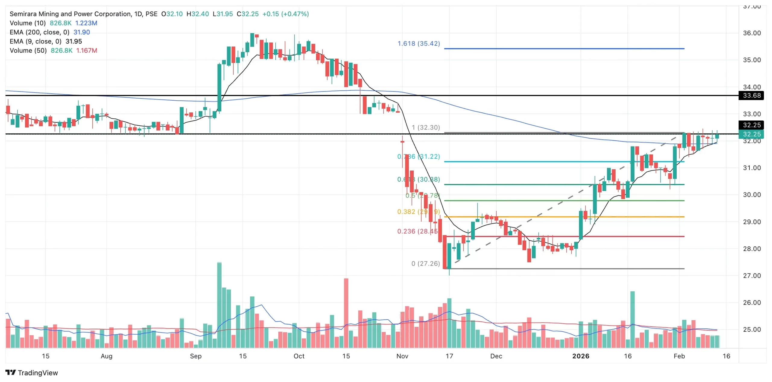 SCC has been attempting to break above the ₱32.25 resistance since the first week of February, but repeated attempts have failed to produce a decisive breakout. This level now acts as both a technical ceiling and a psychological barrier.