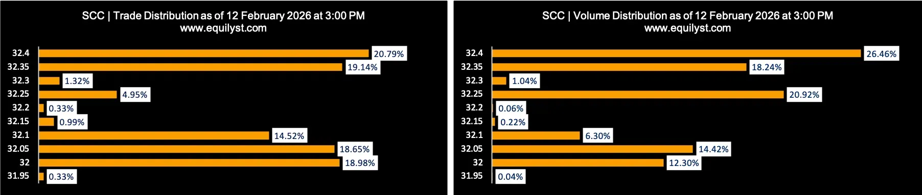 Semirara Mining and Power Corporation (SCC) closed on February 12, 2026 at ₱32.25, up 0.47%, with a Net Foreign Buy of ₱9.7 million.
